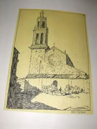 WILLI GEIGER *. ORIGINAL-FEDERZEICHNUNG: "Italien.-Campagna Kirche" - schwarz gezeichnet auf gelbes China-Papier mit Rand - Platz mit Schatten an d. Häuser... Handsigniert unten rechts mit Bleistift. (zu Italien.-Mappe)