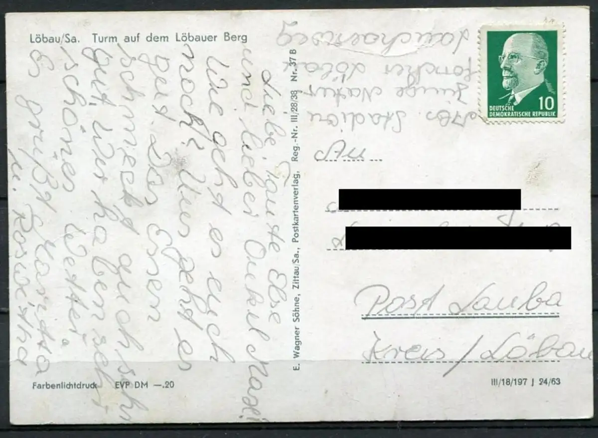 Verlag: E. Wagner Söhne, Zittau/Sa., Postkartenverlag, Reg.-Nr. III/28/38 Nr. 37 B III/18/197 J 24/63Die schwarzen Balken im Adressfeld sind auf dem Original nicht vorhanden.MängelErhaltung - siehe Scans