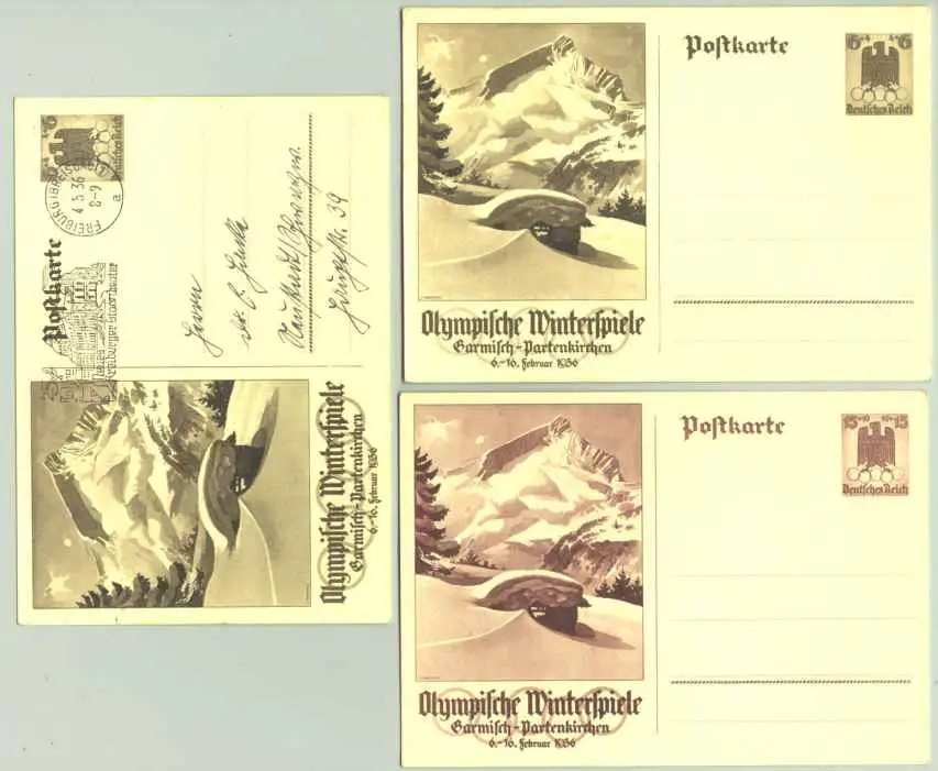 (0270118) 3 x Postkarten Olympiade 1936 : Gedenkpostkarte mit Bild u. eingedrucktem Wert 6+4 Rpf. / Reichsadler m. Olympischen Ringen. Links Abb. Winterlandschaft m. Alpspitze, darunter Text : 'Olympische Winterspiele Garmisch-Partenkirchen 6. bis 16. Februar 1936'. Unbeschrieben.