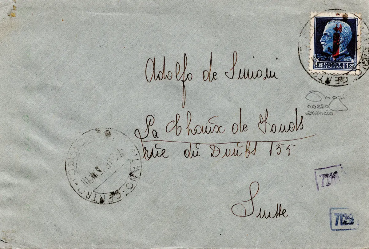 Umschlag - Lireband 1,25 Nr. 495E Aufdruck rot orange isoliert auf Umschlag von Mailand in die Schweiz am 7.2.45 - Rückseite Ann. der Zensur 81R - Ray. - Kat. euro 250 Cod. 203/17