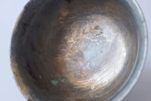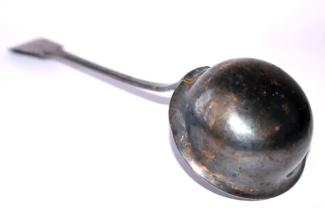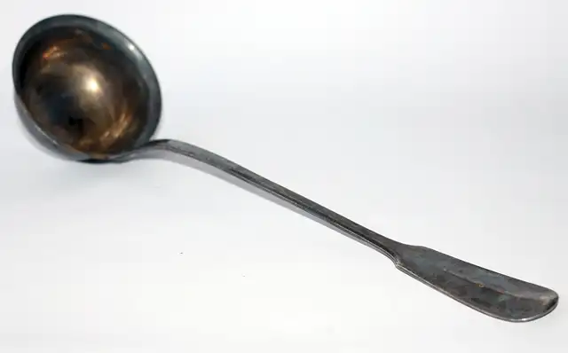 1 Schöpfkelle, mit Punzierung "Eislingen 8 (Lot), ungereinigt, unpoliert, ohne Initialen Gewicht 234g; Länge: 20,1; Breite: 2,3 cm (mehr Silber: www.gefuna.de)
