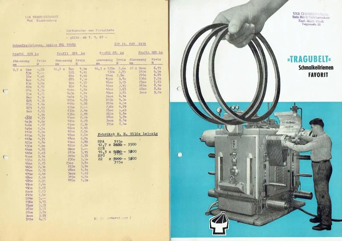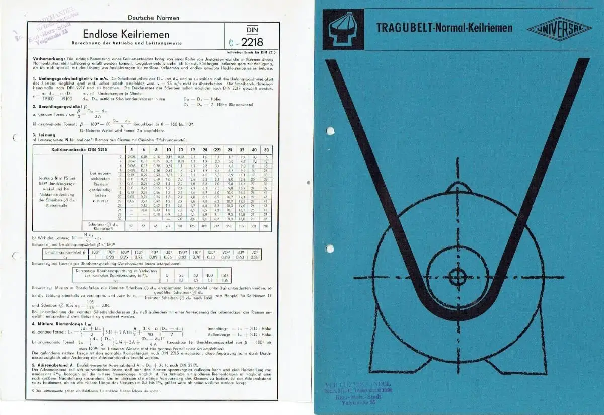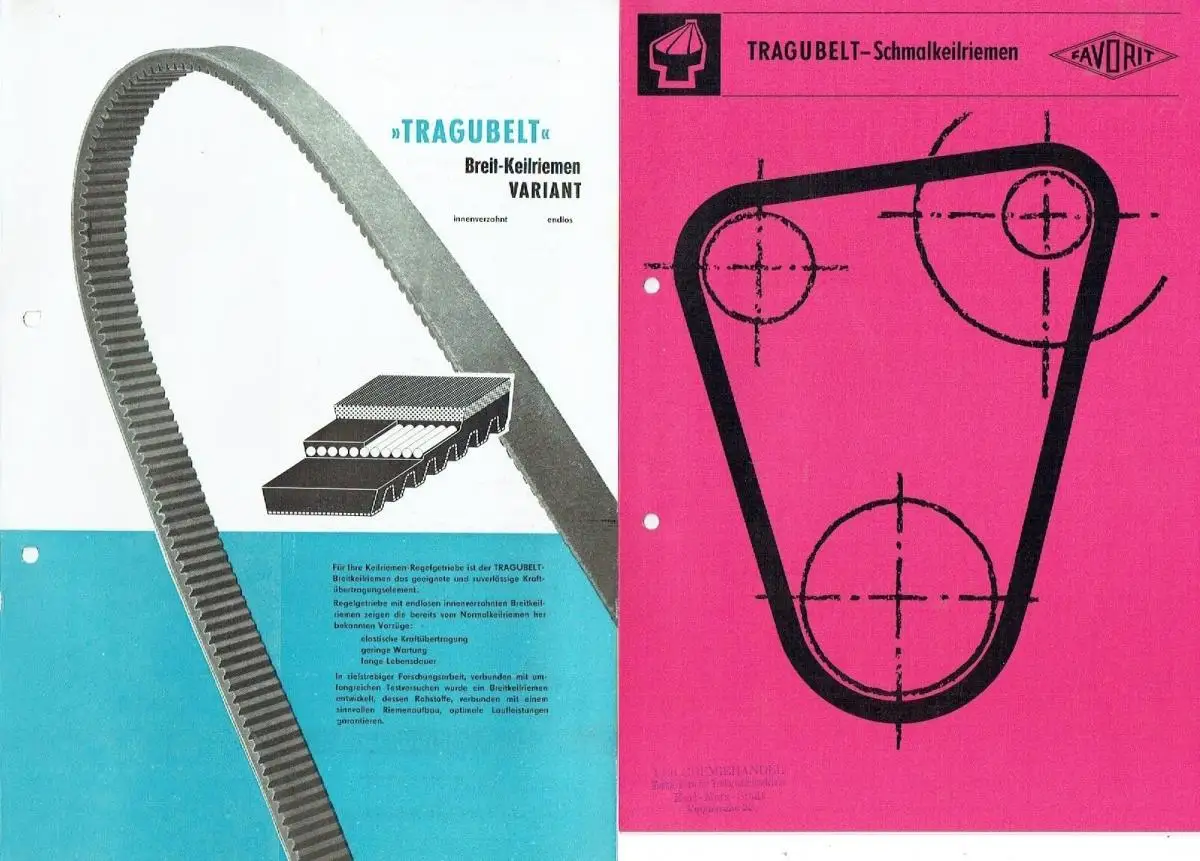 guter bis sehr guter Zustand, geringe Gebrauchs- und Alterungsspuren: gelocht im Heftstreifen - Seiten überwiegend sauber und ordentlich - gelegentlich gering eselsohrig - wenige kleine Blessuren - einige mit Firmenstempel, Sie erhalten folgende Prospekte: - technica 67, Themen-Nr. 3.1.04: Schmalkeilriementriebe (1967, A5, 8 Seiten) - "Tragubelt" Schmalkeimriemen Favorit (1965) - Sortiments- und Preisliste ab 1.1.1967 - Leistungswerte für Schmalkeilriemen (1964) - "Tragubelt" Schmalkeimriemen Favorit (1968) - "Tragubelt" Breit-Keimriemen Variant (1965) - Hinweise für den Einsatz des innengezahnten Breitkeilriemens Tragubelt Variant (1967) - "Tragubelt" Breit-Keimriemen Variant (1968) - "Tragubelt" Normal-Keimriemen Universal (1968) - Deutsche Normen für Keilriemen (4 Seiten DIN 2215-2218) Anwendungsgebiete, technische Daten, technische Zeichnungen etc, Softcover, zumeist ca. 21 x 29,5, ca. 40 Seiten (A4) und 8 (A5) mit einigen Bildern