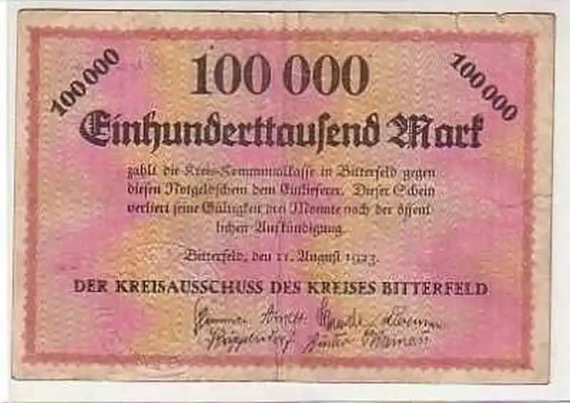 100000 Mark 11.August 1923, Kreisausschuss des Kreises Bitterfeld, gebrauchte Erhaltung siehe Bild,