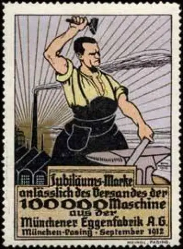 Jubiläums - Marke anlässlich des Versandes der 100.000 Maschine aus der Münchener Eggenfabrik AG, Landwirtschaft, Größe/Zustand: 6x5 , guter Zustand, Original alte Reklamemarke die seinerzeit für die Werbung benutzt wurde