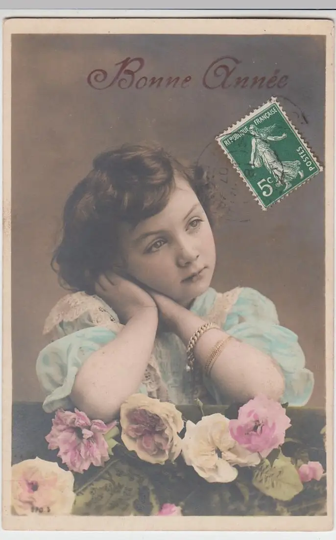 - (100567) Foto Ansichtskarte, postcard, PPC - Bonne Année, Neujahr, Mädchen mit Rosenblüten 1907