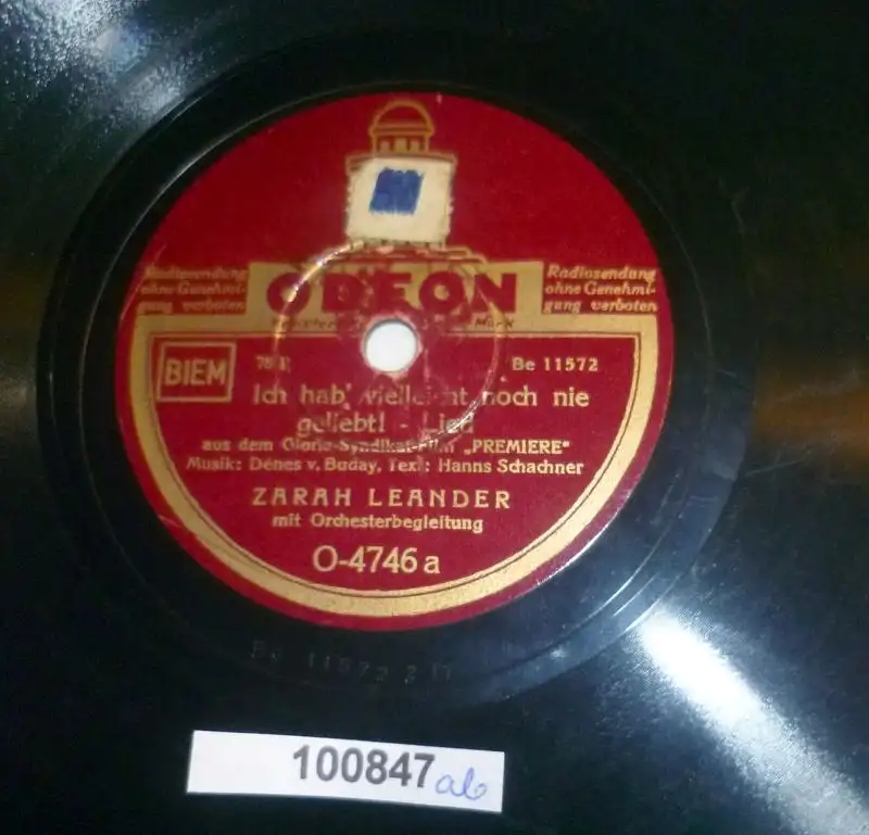Durchmesser 25 cm Odeon Nr. 4746, "Merci, mon ami ..." aus dem Gloria Syndikat Film "Premiere", und "Ich hab´vielleicht noch nie geliebt!" aus dem Gloria Syndikat Film "Premiere", Zarah Leander mit Orchester, gebrauchte Erhaltung (minimaler Randchip) siehe Bild,