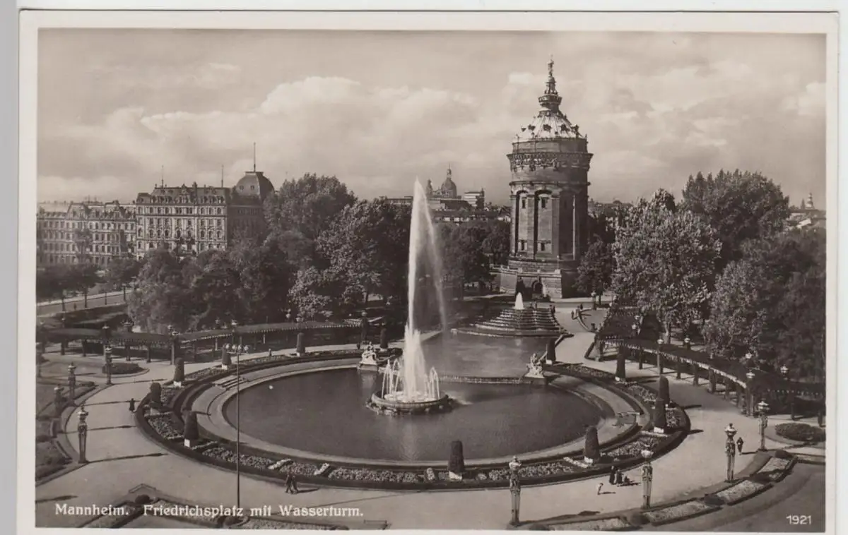 (101334) Foto AK Mannheim, Wasserturm, Friedrichsplatz, Fontäne, vor 1945