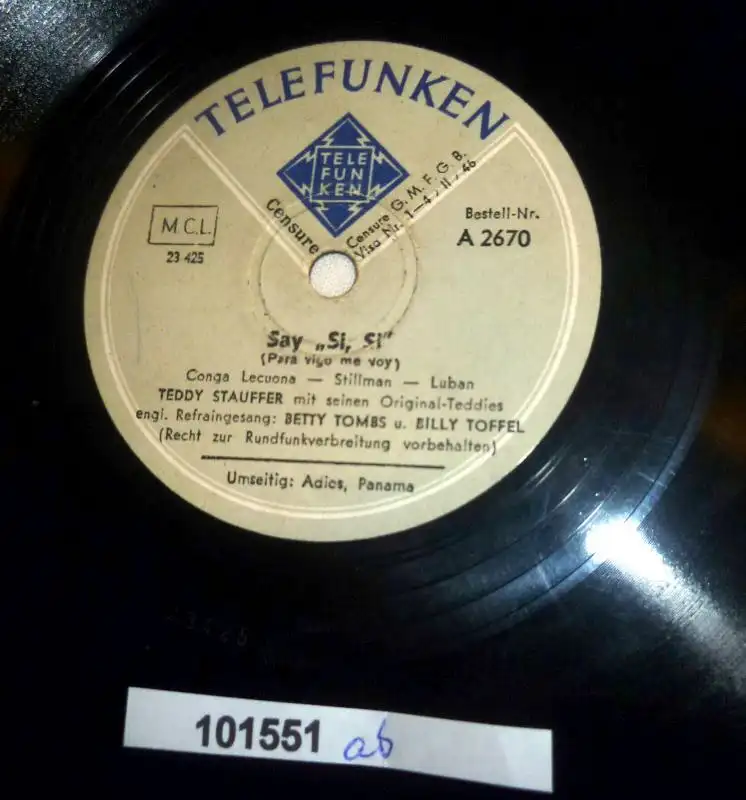 Durchmesser 25 cm Telefunken Nr. A 2670 "Say Si, Si" engl. Refraingesang Betty Tombs u. Billy Toffel und "Adios, Panama" Kubanischer Refraingesang Billy Toffel Teddy Stauffer mit seinen Original-Teddies guter Zustand, geringe Altersspuren, siehe Bild