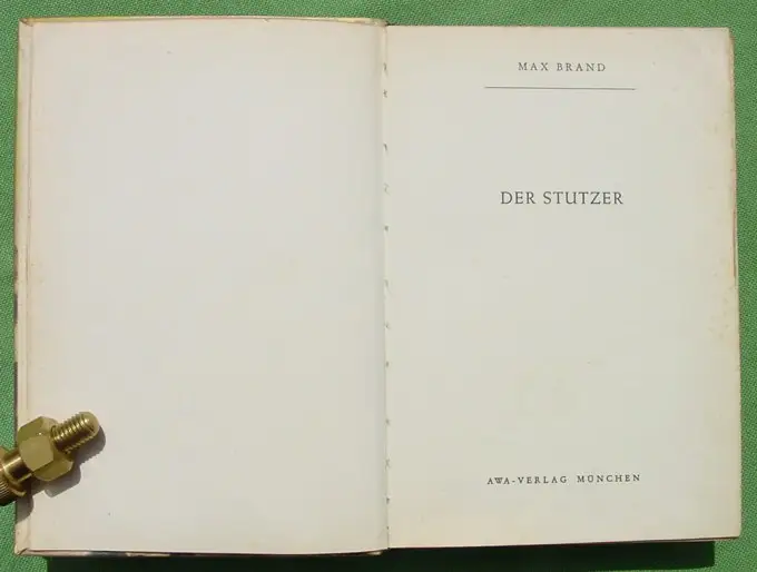 "Der Stutzer". Von Max Brand. Wildwest-Abenteuer. Halbleinenband. 256 Seiten. AWA-Verlag Muenchen. Ehemaliges Leihbuch aus einer Leihbuecherei mit entprechenden Gebrauchsspuren. Plastikschutzhuelle ist entfernt. Meines Erachten ein sammelwuerdiges Exemplar. Katalogwert in Z. 1 = Euro 25,00