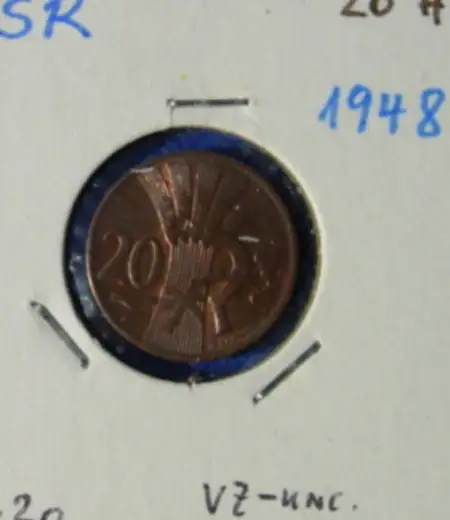 (1042764) Muenze. Tschechoslowakei. 20 Heller 1948 (KM. 20) Meiner Meinung nach "vorzueglich-bankfrisch" !?