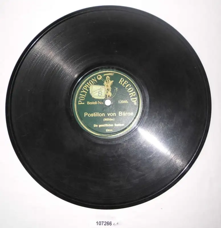 Durchmesser 25 cm Polyphon Nr. 12946 "Hornist Tute" (Mühlau) Die gemütlichen Sachsen, und "Postillon von Bärne" (Mühlau) Die gemütlichen Sachsen, guter gebrauchter Zustand (normale Altersspuren) siehe Bild,