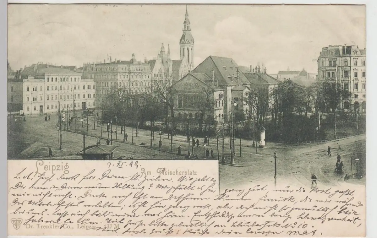 - (108849) Ansichtskarte, postcard, PPC - Leipzig, Fleischerplatz, Altes Theater, Reformierte Kirche 1899
