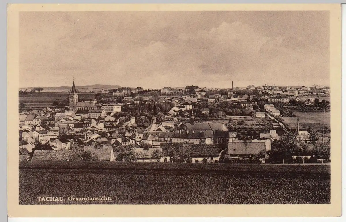- (109507) Ansichtskarte, postcard, PPC - Tachau, Tachov, Panorama mit Kirche 1938