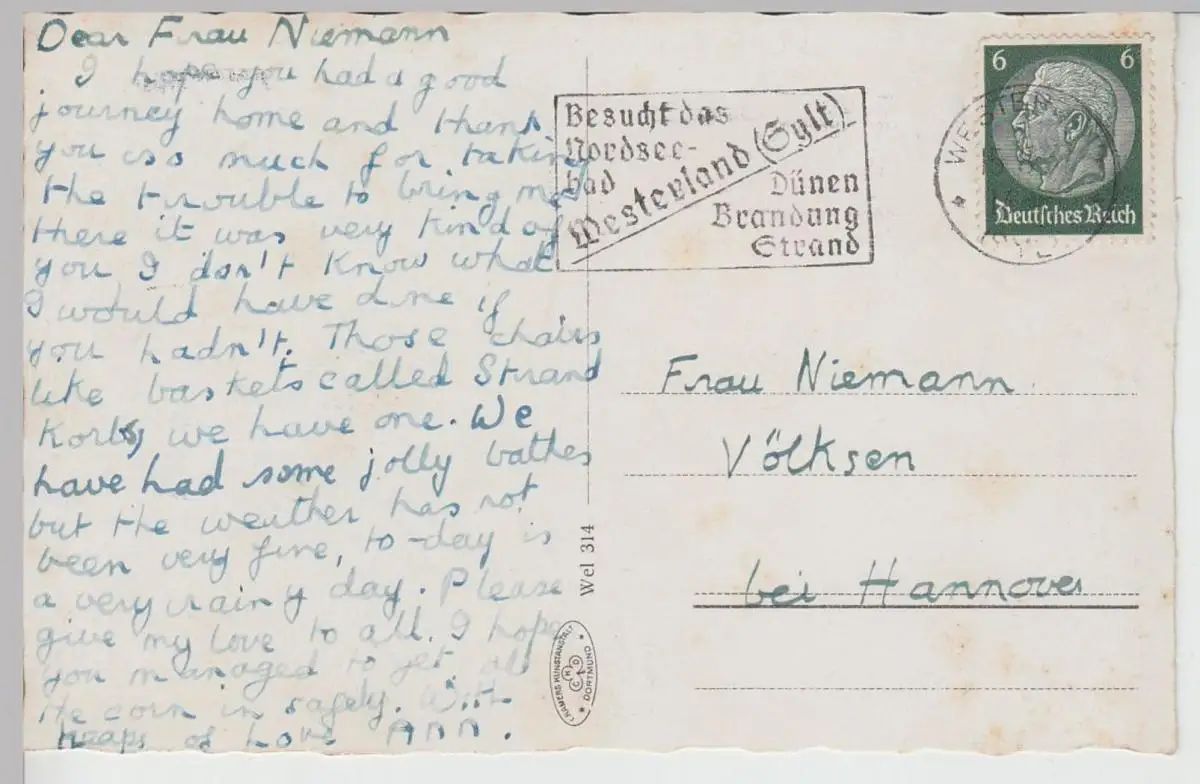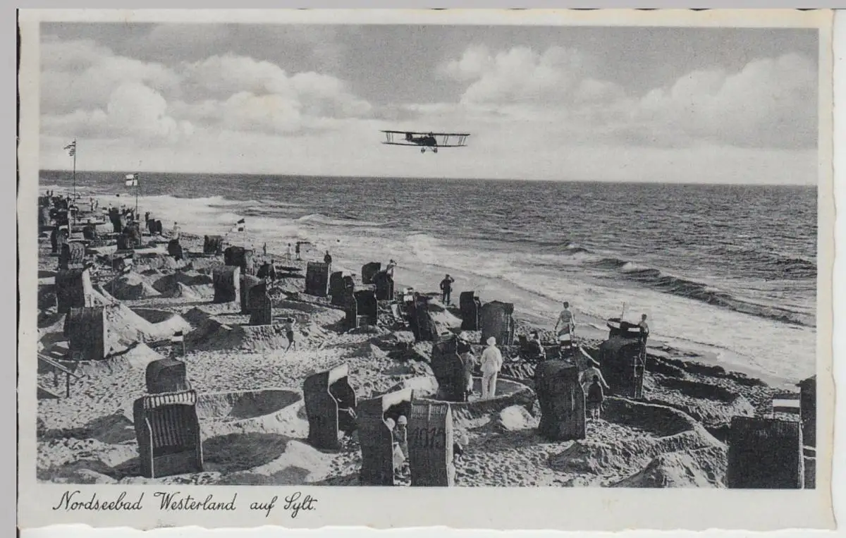 - (112478) Ansichtskarte, postcard, PPC - Sylt, Westerland, Strand, Strandkörbe, Doppeldecker 1937
