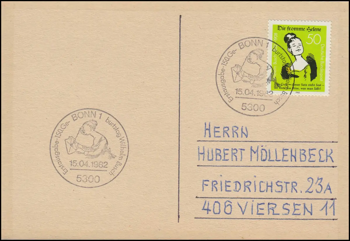 1129 W. Busch Die fromme Helene: selbstgemalte Maximumkarte ESSt Bonn 15.4.1982