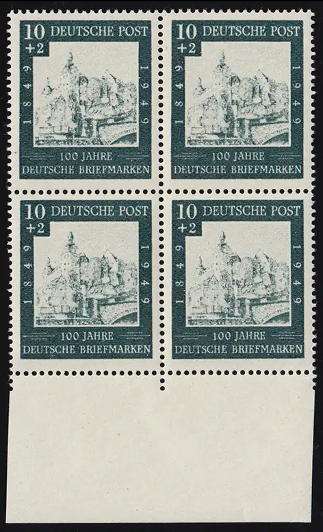Versuchsdruck der Firma Bruckmann aus dem Jahre 1949 für die Ausgabe "100 Jahre Deutsche Briefmarken", 10 + 2 Pf. Der Rahmen gleicht der MICHEL-Nr. 113 (Wertangabe links statt rechts). Probehalber wurde ein anderes Markenbild eingelegt. Als die Fa. Bruckmann in den achtziger Jahren in Konkurs ging, gelangte ein Teil dieser Drucke in den Handel. Vgl. auch den Hinweis im MICHEL-Deutschland-Spezial-Katalog!