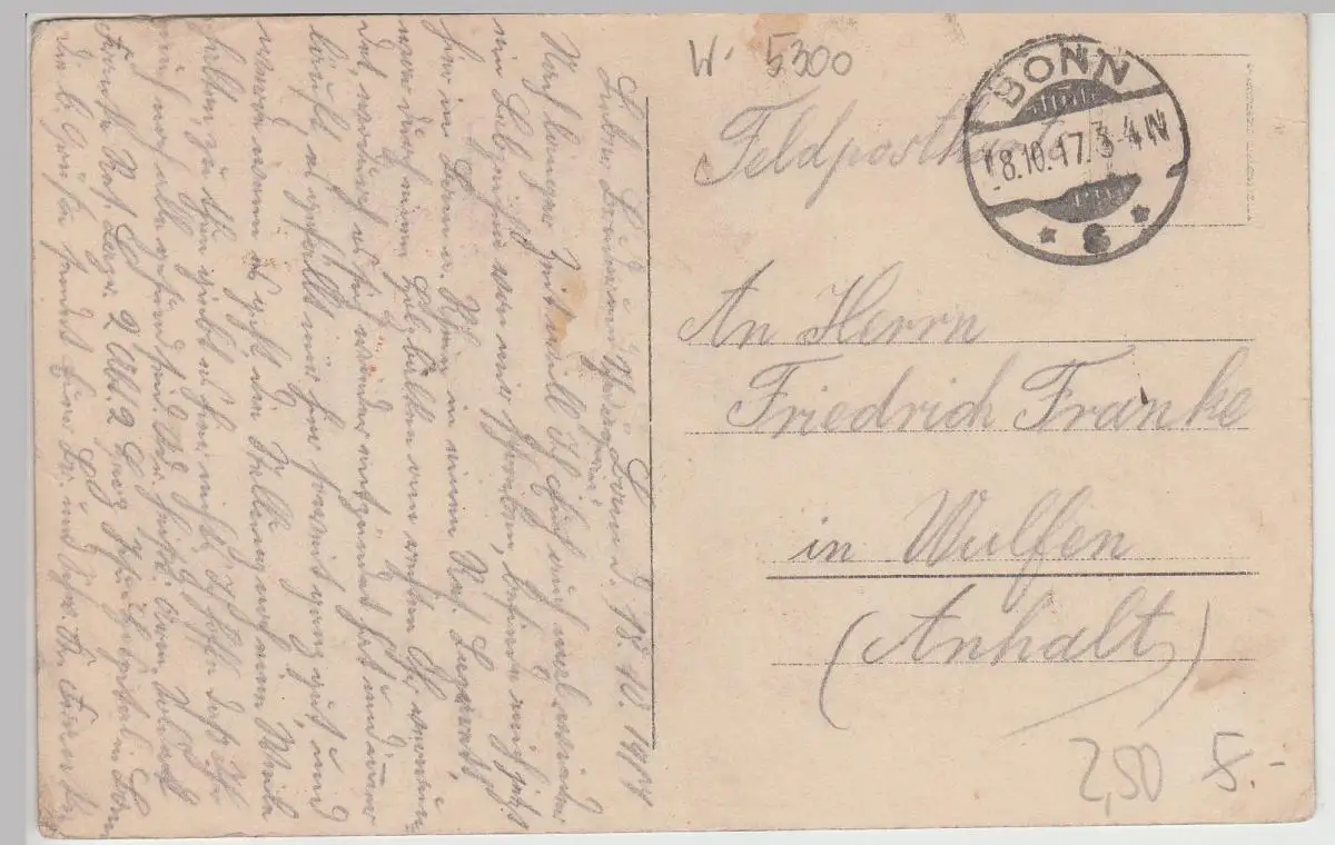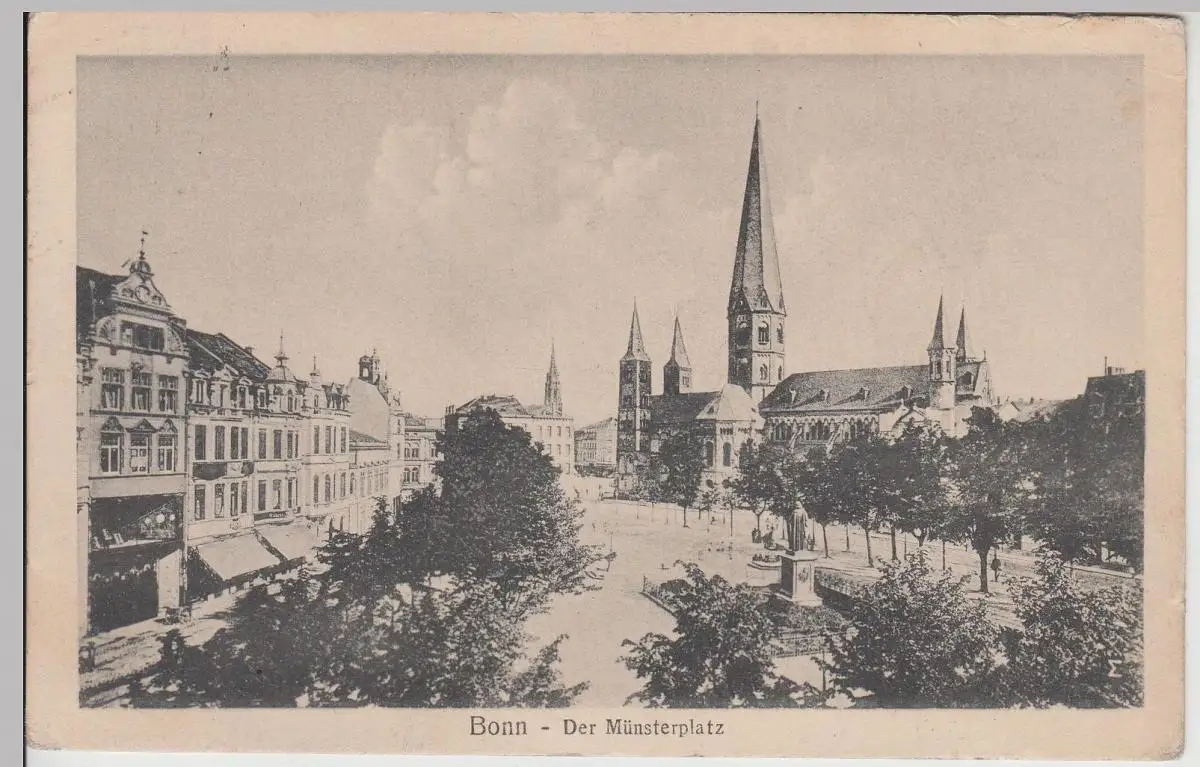 - (113991) Ansichtskarte, postcard, PPC - Bonn, Münsterplatz, Kirche, Beethoven Denkmal, Feldpost 1917