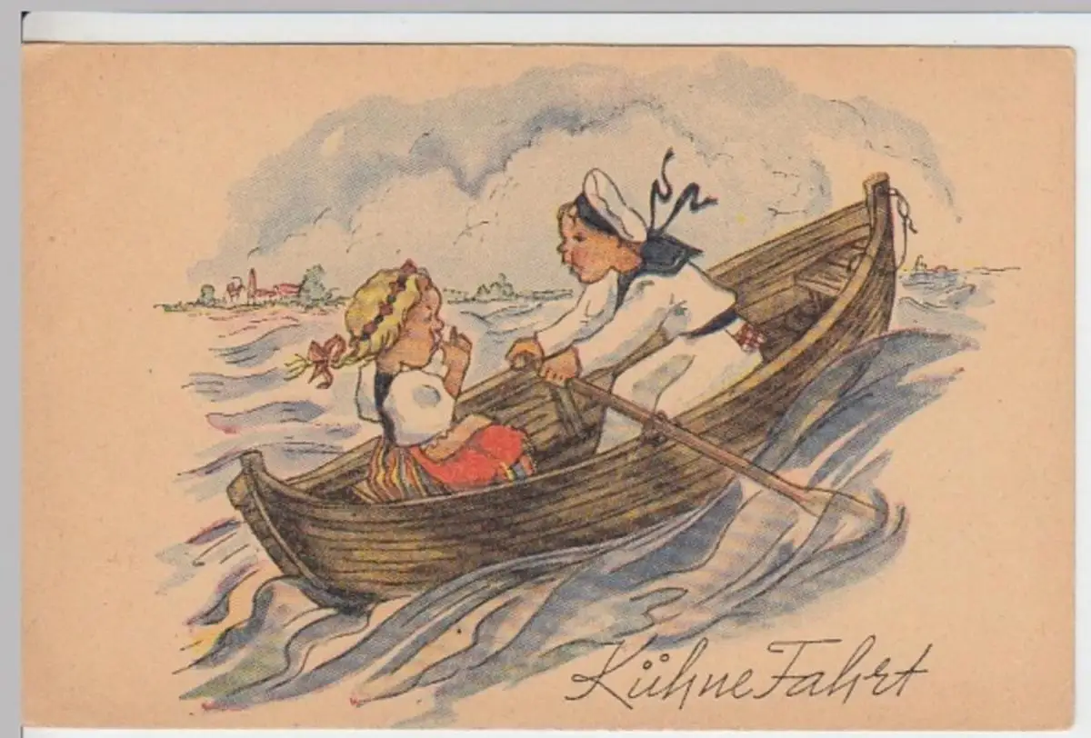 - (12216) Künstler Ansichtskarte, postcard, PPC - Kühne Fahrt, Kleiner Matrose u. Mädchen in Boot
