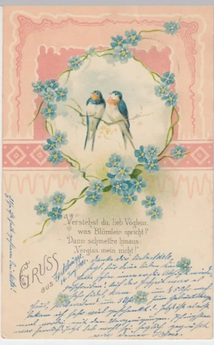 - (12422) Ansichtskarte, postcard, PPC - Gruß aus, Verstehst du lieb Vöglein was Blümlein 1901