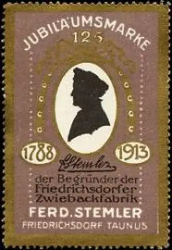Ferd. Stemler der Begründer der Friedrichsdorfer Zwiebackfabrik, Größe/Zustand: 6x4 , guter Zustand, Original alte Reklamemarke die seinerzeit für die Werbung benutzt wurde