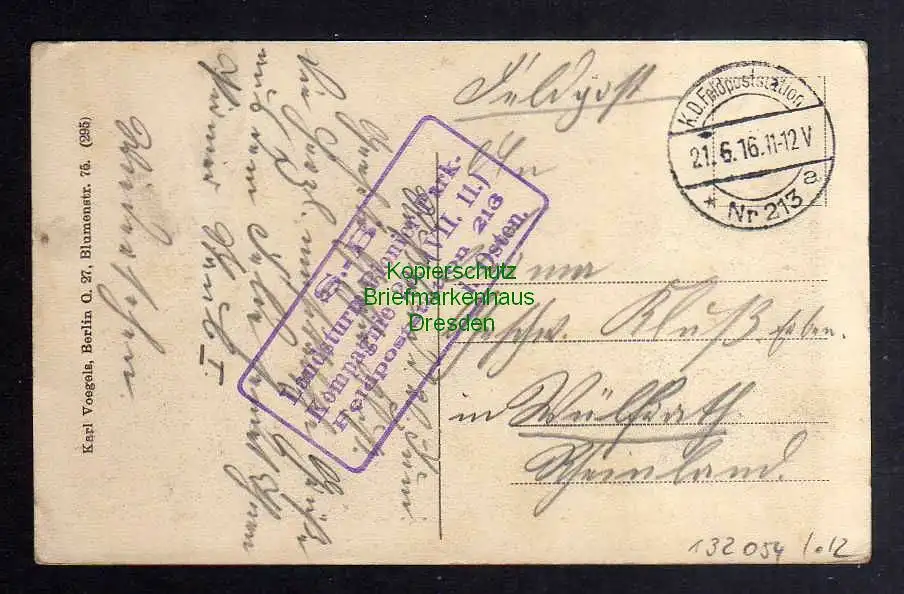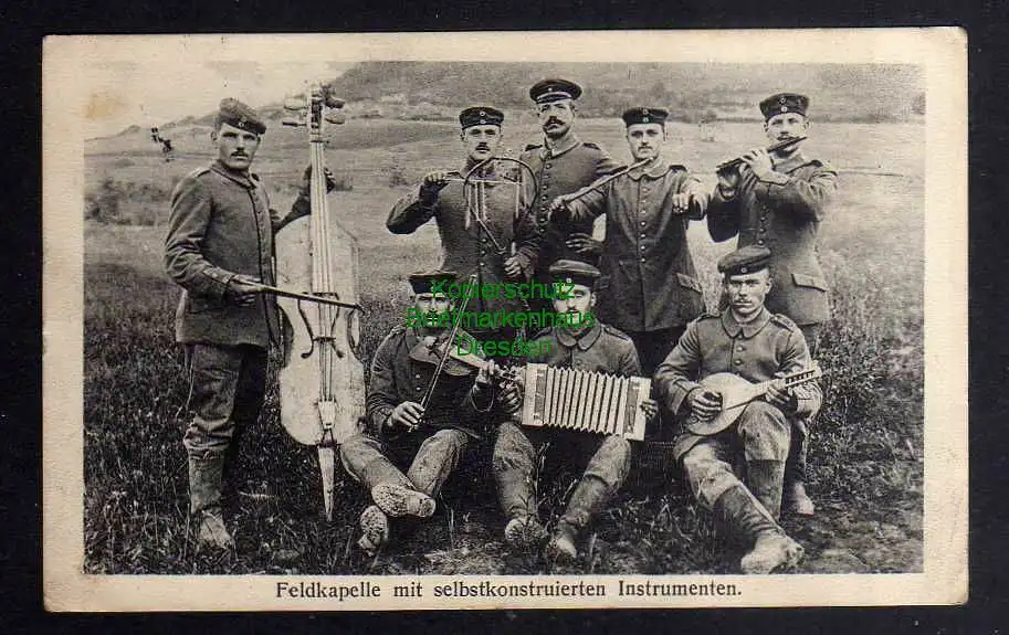 132054 Ansichtskarte 1. Weltkrieg 1916 Feldpost Militär Feldkapelle selbstkonstruiere Instrumente
