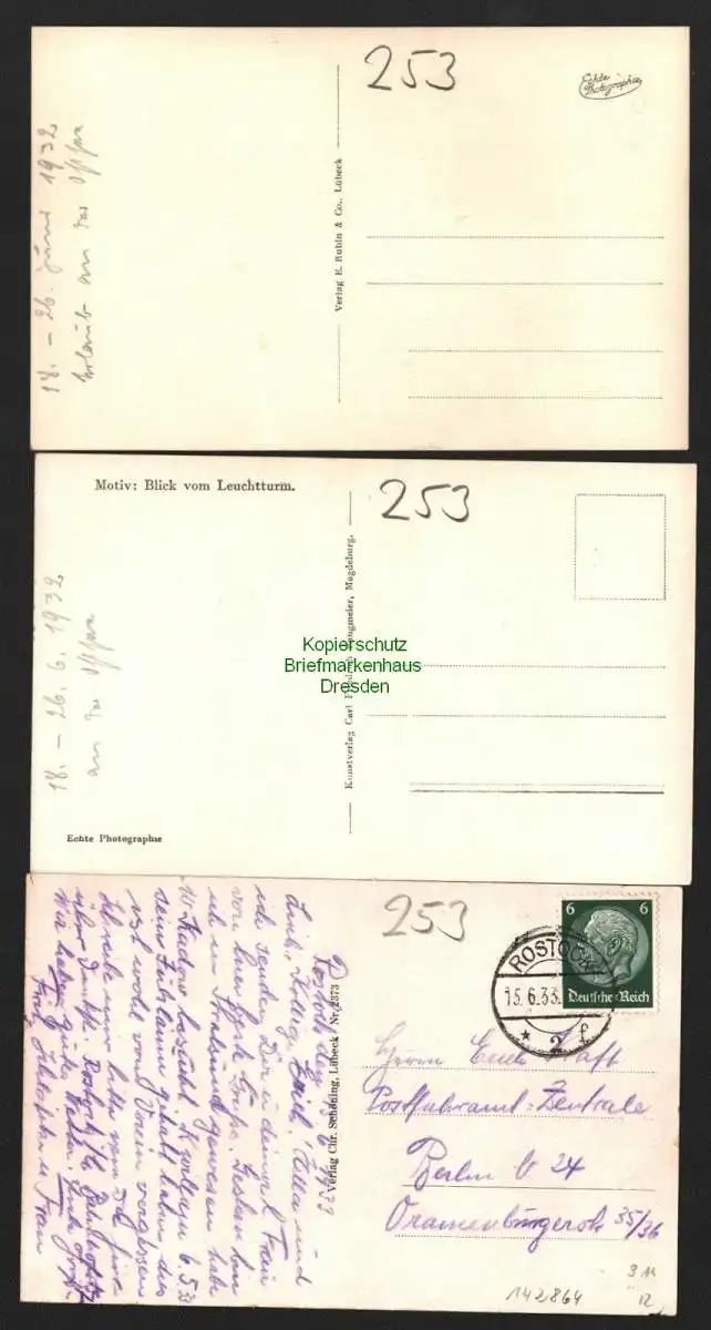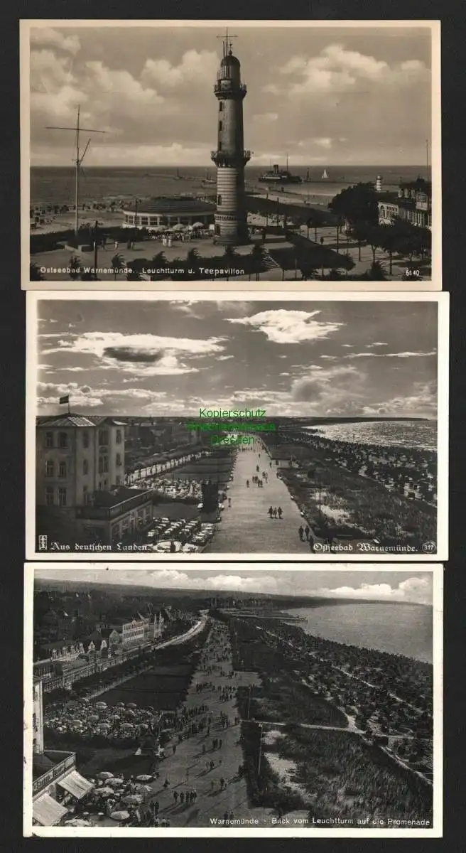 142864 3 Ansichtskarte Ostseebad Warnemünde Leuchtturm Teepavillon 1932 Strandpromenade 1933