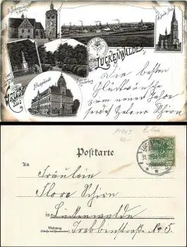 14943 Gruss aus... Luckenwalde Litho, s/w, o 31.2.1899 Erh.I-II St. Jacobi Kirche, Postgebäude, Johanniskirchturm, Denkmal