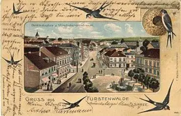 15517 Fürstenwalde, Gruss aus ..., Denkmalsplatz u. Münchebergerstr., Farblitho, o 12.3.05