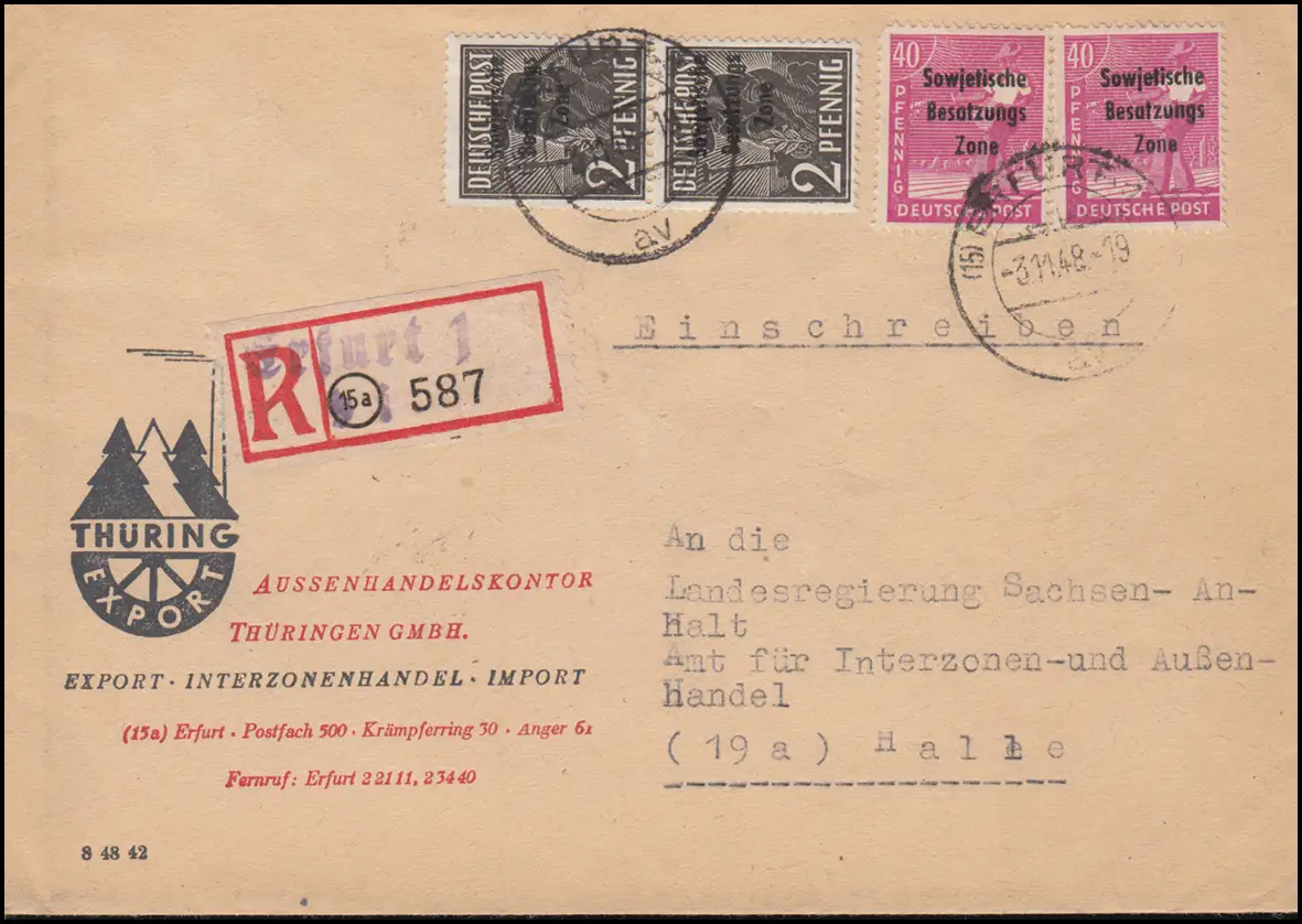 182+193 SBZ-Aufdrucke in MiF auf R-Brief mit Not-R-Zettel ERFURT 1 - 3.11.1948