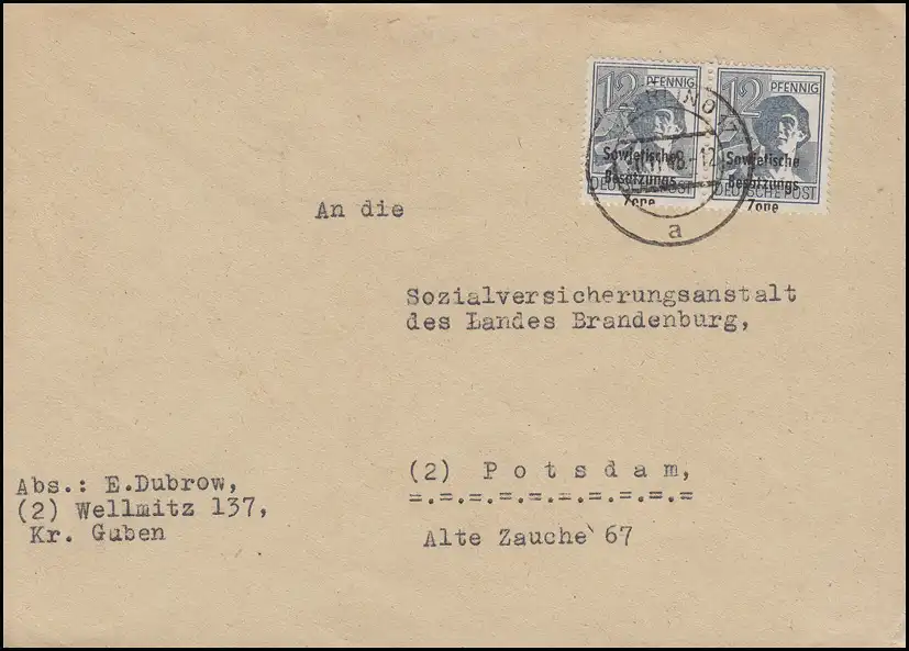 SBZ-Aufdruck bei beiden Marken stark nach unten über die Zähnung hinaus verschoben. Fernbrief nach Potsdam.