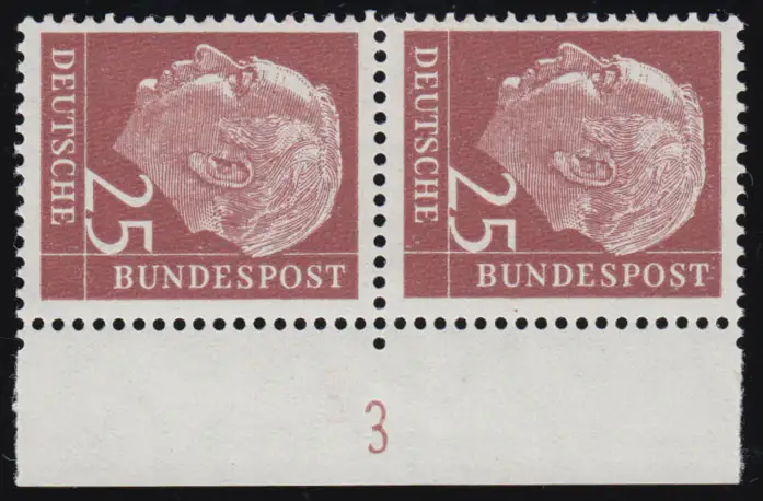 186xw Heuss 25 Pf Randpaar mit Druckerzeichen DZ 3 positiv, ungefaltet, **