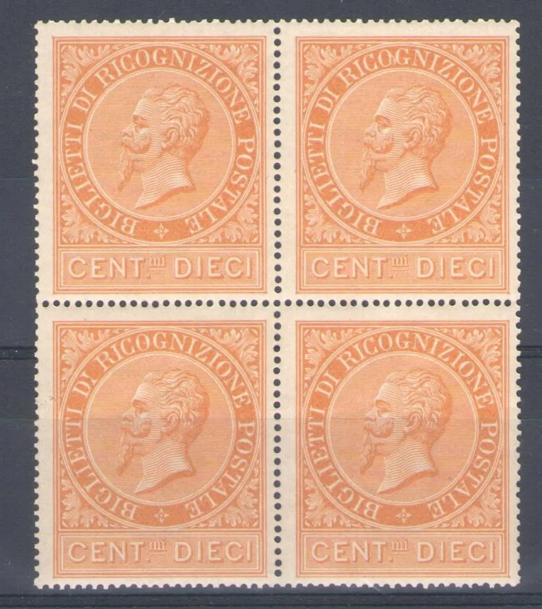 1874 Königreich Italien, Abbildnis von König Vittorio Emanuele II., 10 Cent Ocker Postanerkennung, postfrisch mit originalem Vollgummi und dezent / sehr gut zentriert - Quartina ungemeinsamer Sächsischer Katalog Euro 3150 ++ Album Bordeaux Königreich Philatelie - Sammeln - Postanerkennung - Bildnis von Vittorio Emanuele II - Bogenrand - Bogenwinkel - Tischnummer - Quartina - Seltene Briefmarken - Verbessern Sie Ihre Sammlung mit hochwertigen Briefmarken - Philatelie