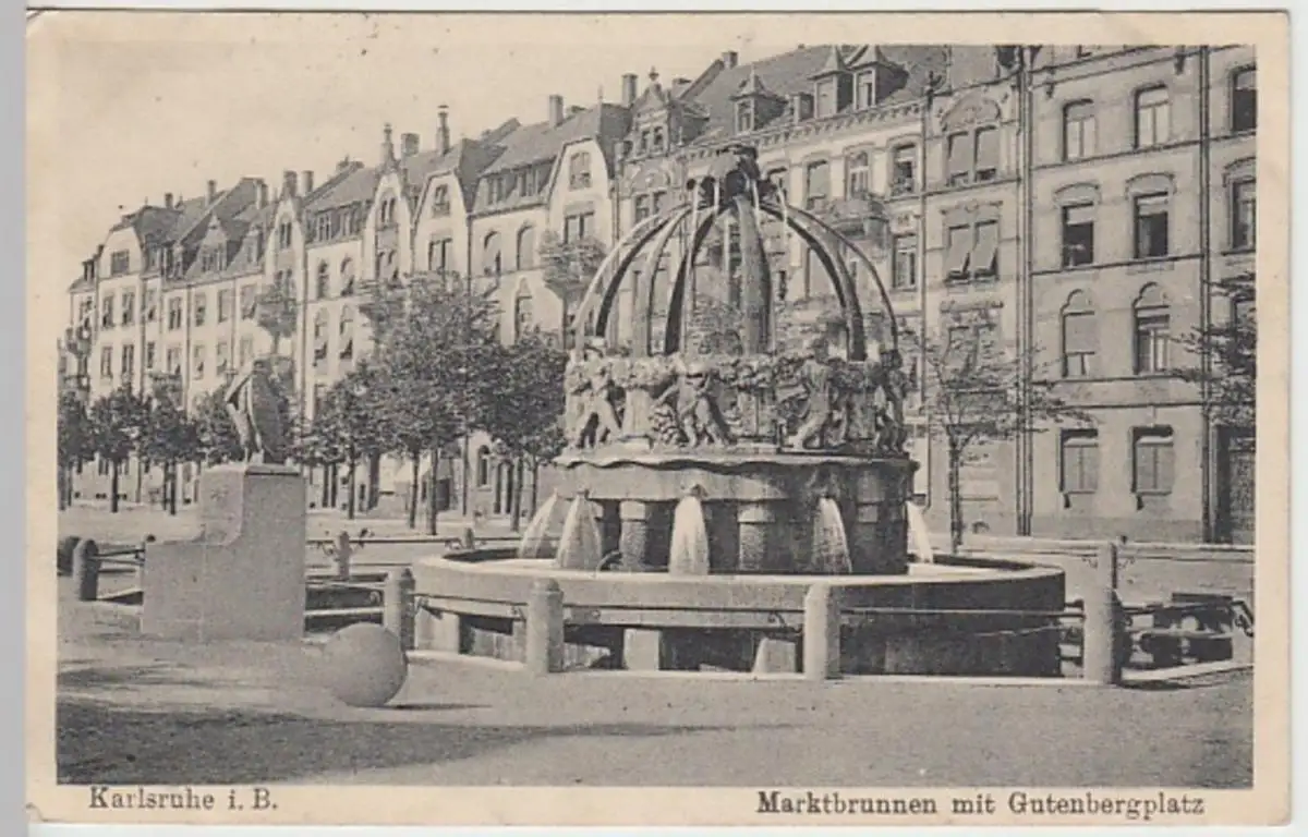 - (18969) Ansichtskarte, postcard, PPC - Karlsruhe, Marktbrunnen, Gutenbergplatz, Feldpost 1916