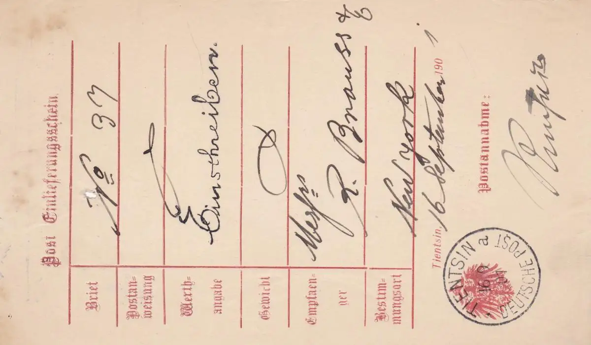 1901: Tientsin-Deutsche Post-Einlieferungsschein Einschreiben