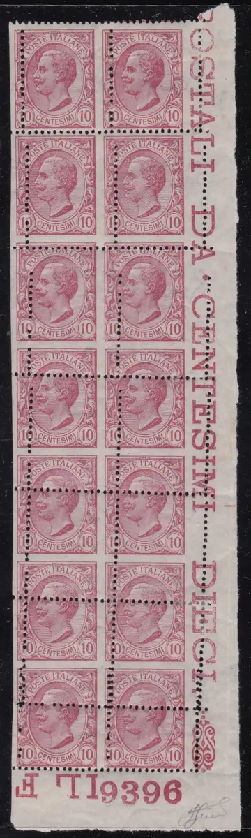 1906 Italien - Königreich, Nr. 82 Block von 14 MNH / ** STARK NACH UNTEN UND RECHTS VERSCHOBENE VERZAHNUNG MIT TEILWEISE MARGINALEN BESCHRIFTUNGEN INNERHALB DER BRIEFMARKE UND TISCHNUMMER. DIE VERTIKALE VERZAHNUNG WIRD IM DRITTEN HORIZONTALEN PAAR VON OBEN UNTERBROCHEN.