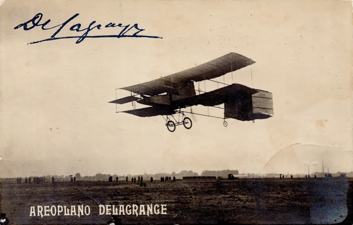 C - 1908 Delagrange - Fotokarte Flugzeug im Flug und Reproduktion der Unterschrift des Piloten; gereist in gutem Erhaltungszustand Cod.115/182