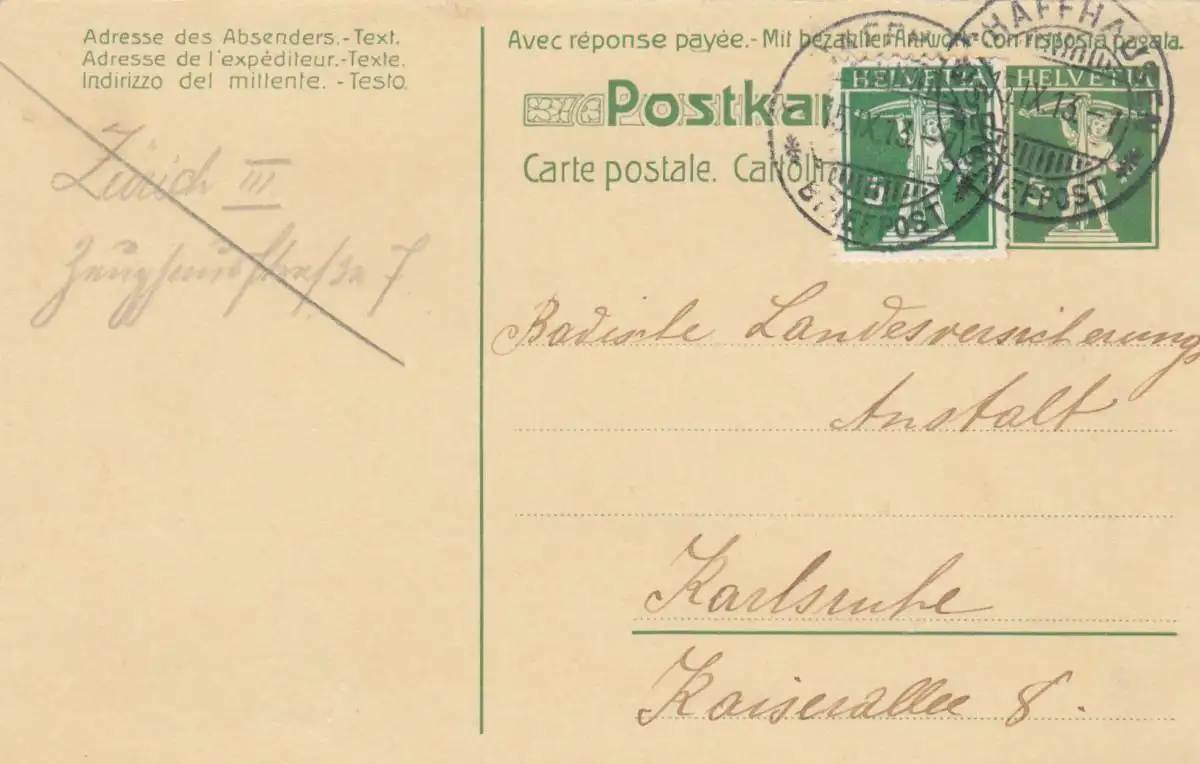1913/23: 2 post cards Schaffhausen/Davos to Karlsruhe/Paris