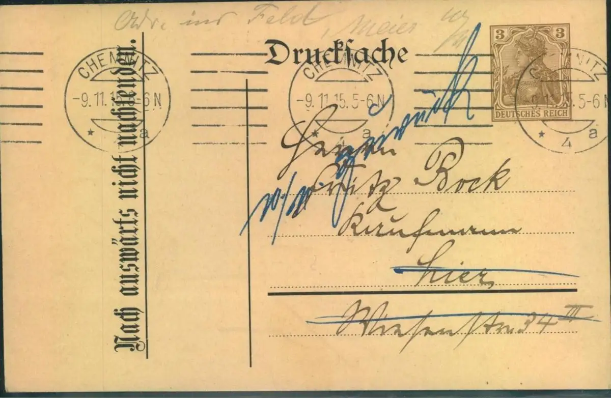 1915, 3 Pfg. Germania Privatganzsachenkarte ab CHEMNITZ - PP 23B 27
