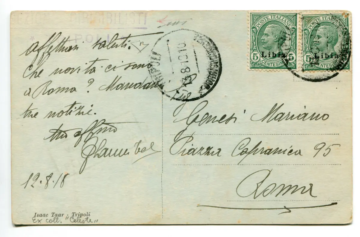 1918 Sektion Luftschifffahrer Tripolis - Postkarte aus Tripolis - 1918 Sektion Luftschifffahrer Tripolis - Postkarte von Tripolis nach Rom am 13.8.18, daneben trägt sie den seltenen Stempel auf zwei Zeilen in violett gedrucktSektion Luftschifffahrer - Tripolis (Unveröffentlichte Cherubini-Taragni) - Interessant für Luftfahrtspezialisten in den Kolonien - A. Bolaffi + Cert. E. Diena (ausführlich signiert) Code 86/8