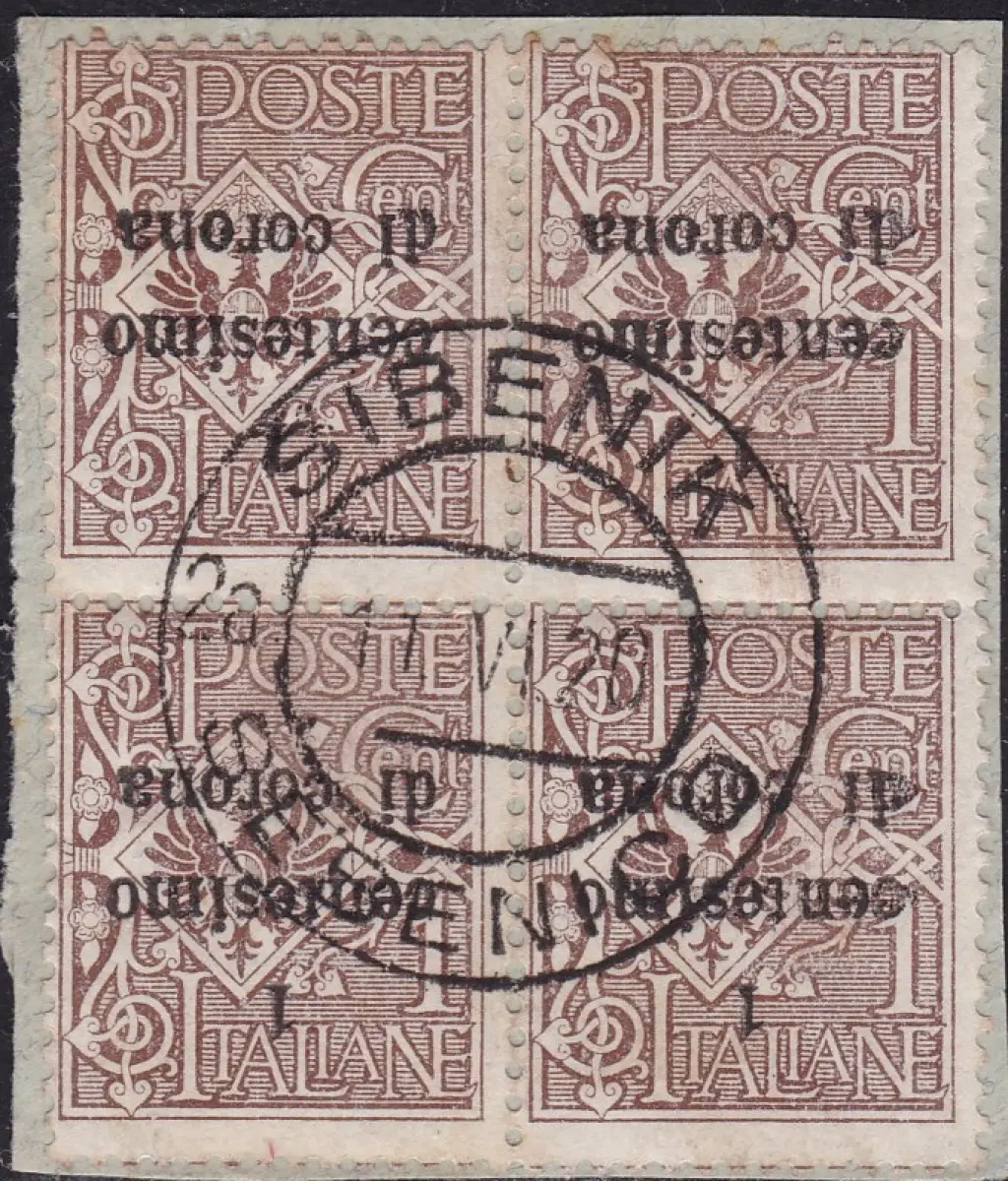 1919 Trient und Triest, Nr. 1aa GEBRAUCHTER VIERERBLOCK MIT UMGEDREHTEM ÜBERDRUCK Zentralstempel Šibenik SÄCHSISCHER KATALOG Euro 140 ++ A 115 LEUCC GRÜNES ALBUM