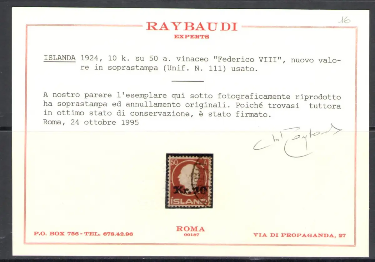 1924-26 Island, Nr. 111 - 10 k. auf 50 v. Chr. - Gebrauchtes Raybaudi Zertifikat Einheitskatalog Euro 450 - grüne Box Ausland