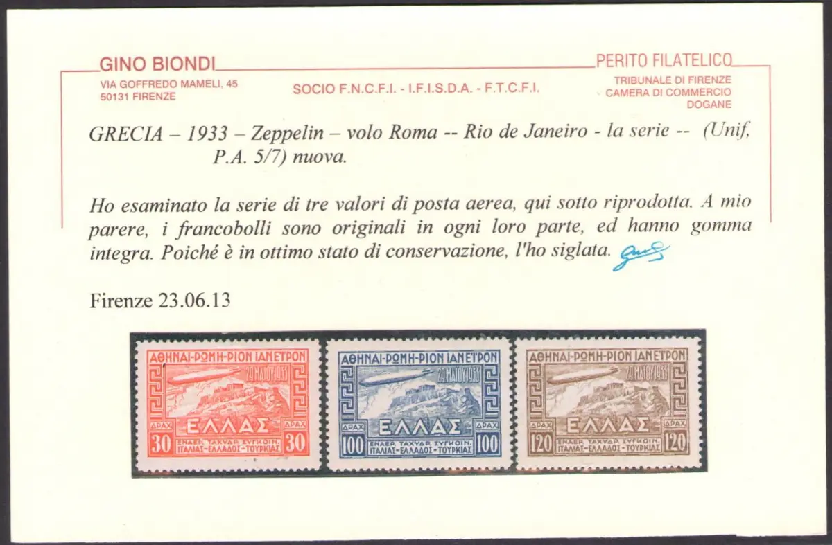 1933 Griechenland - Griechenland, Luftpost - Graf Zeppelin Rom - Rio de Janeiro - Yvert Nr. 5/7 - MNH ** Zertifikat Biondi Yvert Euro 420 - 1 ALB