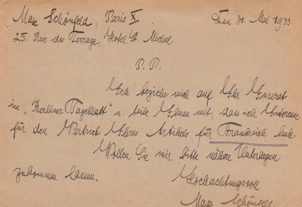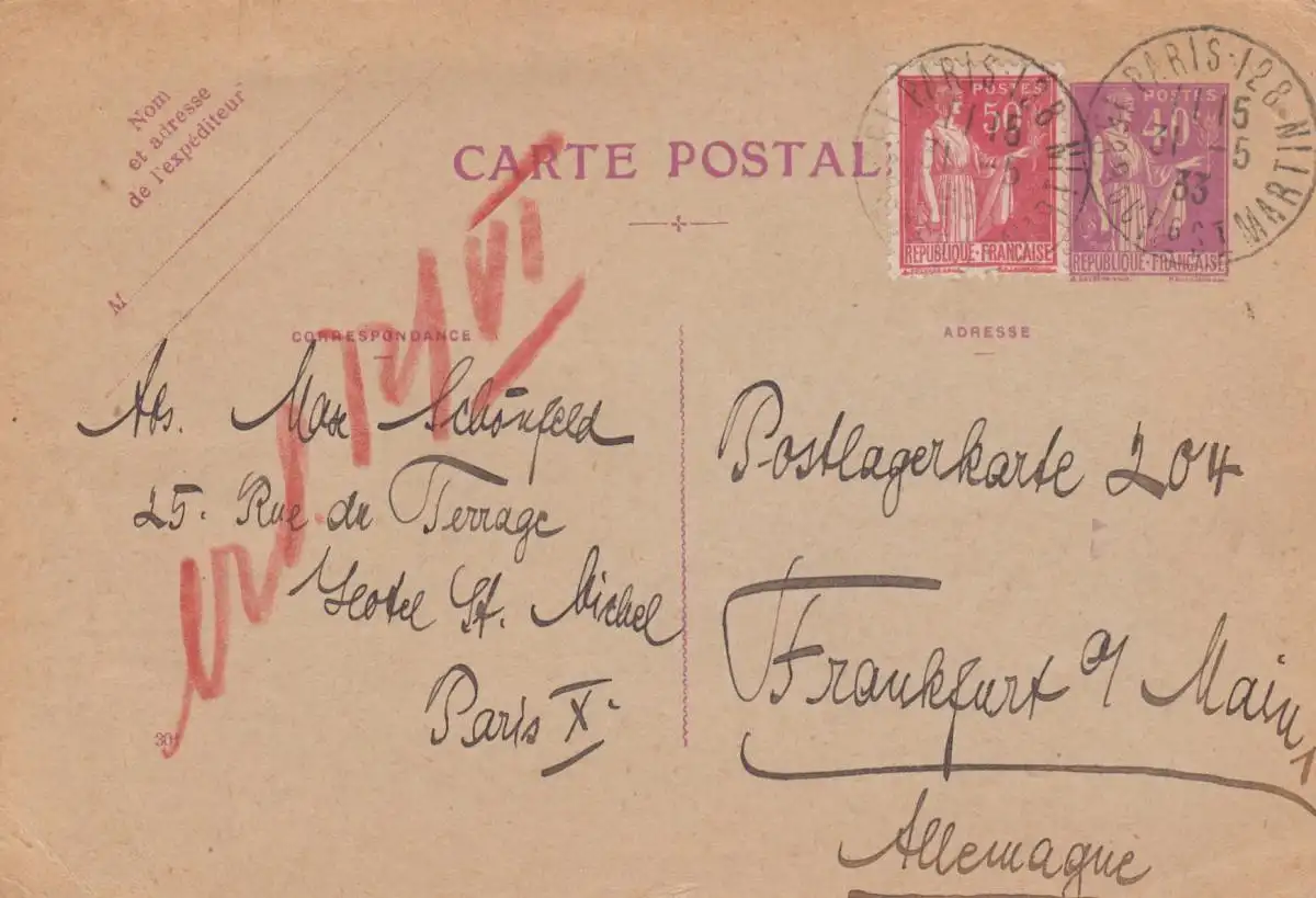 1933: post card Paris to Frankfurt