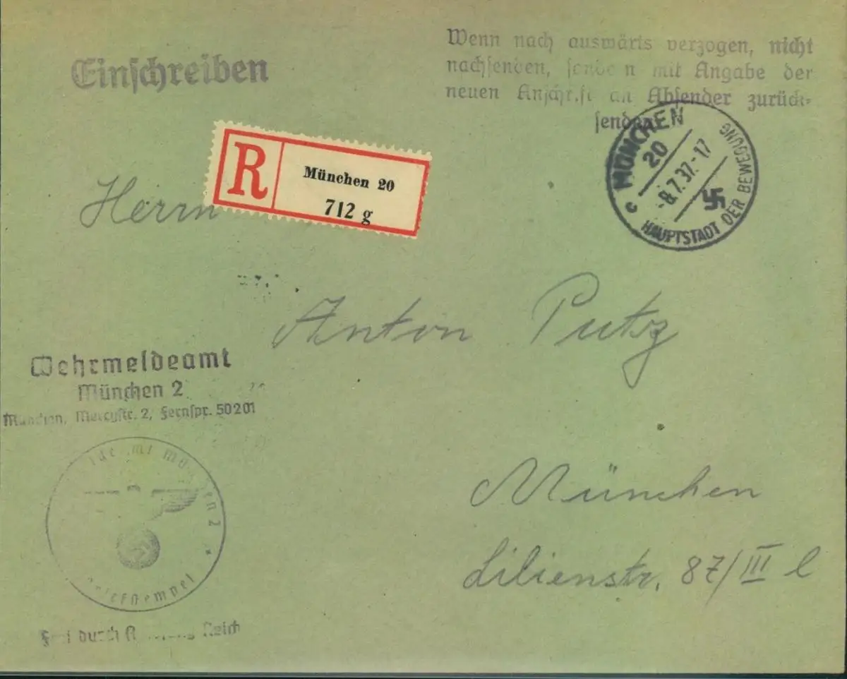 1937, Wehrdiestsache per Einschreiben ab MÜNCHEN 20