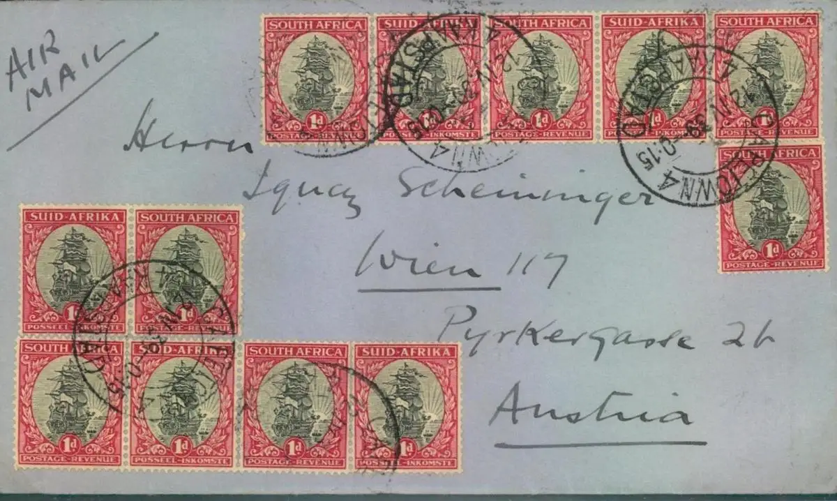 1939, airmail envelope with decorative multiple franking "CAPETOWN" to Vienna