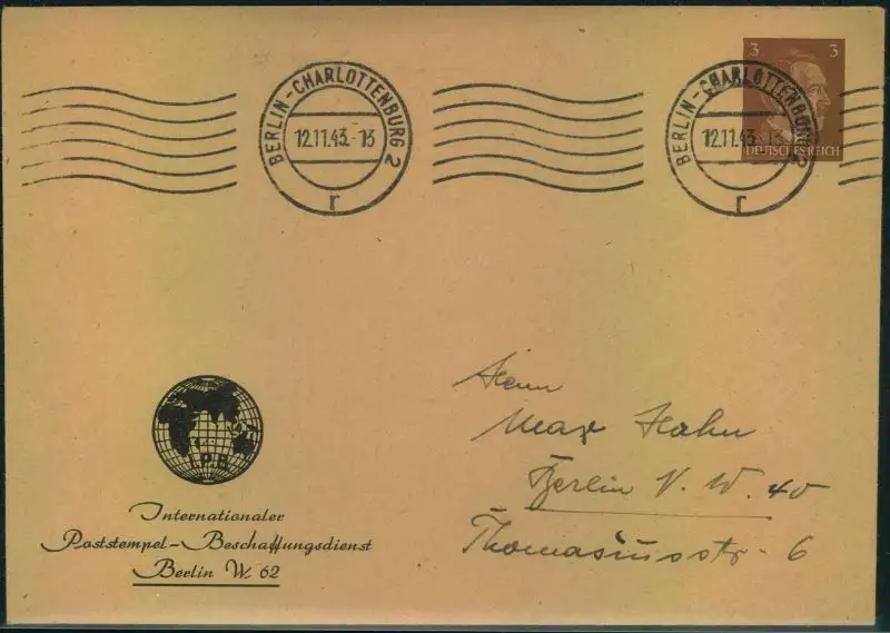 1943, Privatumschlag 3 Pfg. Hitler ab BERLIN-CHARLOTTENBURG