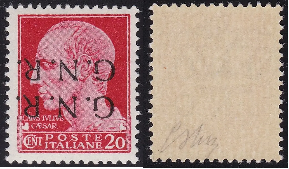 1944 Italienische Sozialrepubblica, Nr. 473c 20 Cent. karmin Doppelaufdruck umgedreht signiert Olive Katalog Sachsen Euro 650 Lot 81