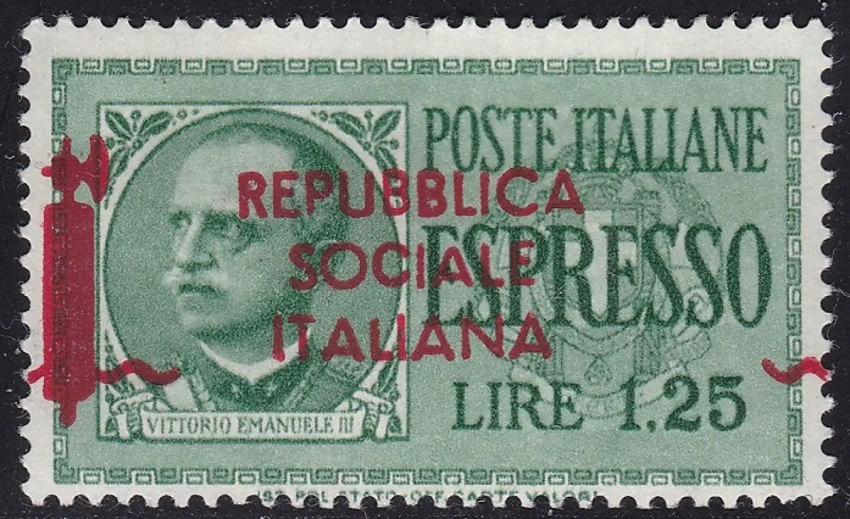 1944 RSI - Espresso Nr. 21Aga 1,25 grün MLH/* GEZÄHNT ÜBERDRUCK STARK NACH LINKS VERSCHOBEN Sächsischer Katalog Euro 325 Lot 81