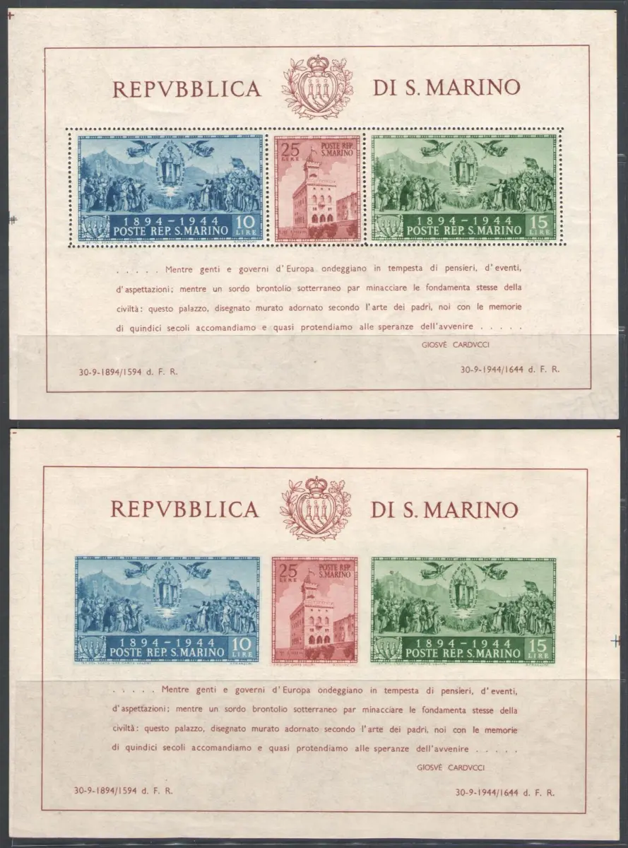 1945 SAN MARINO - BF Nr. 6b/7b MNH/** 50. des Regierungspalastes mit filigranem Hammermill Bond - Made in USA Sächsischer Katalog Euro 525 - rote Box