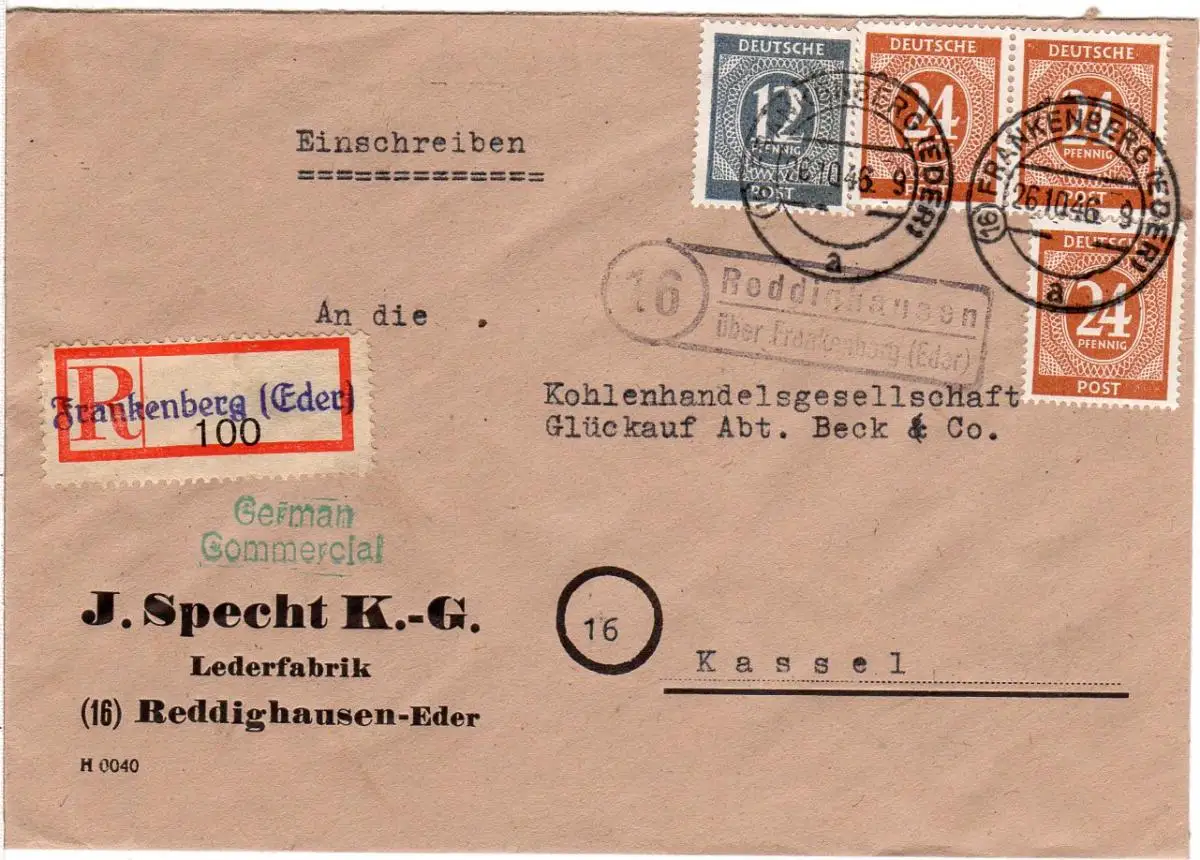 1946, Landpoststempel 16 REDDIGHAUSEN über Frankenberg auf Einschreiben Brief.